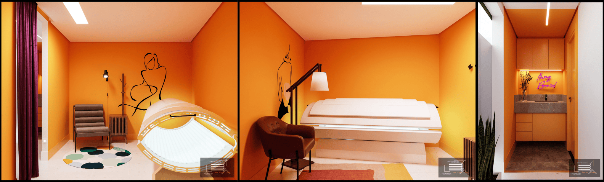 The tanning rooms maintain the same design standards, featuring comfortable chairs and artistically decorated walls. Every detail has been carefully curated to reinforce the desire to share photos, seamlessly blending functionality with aesthetic appeal.