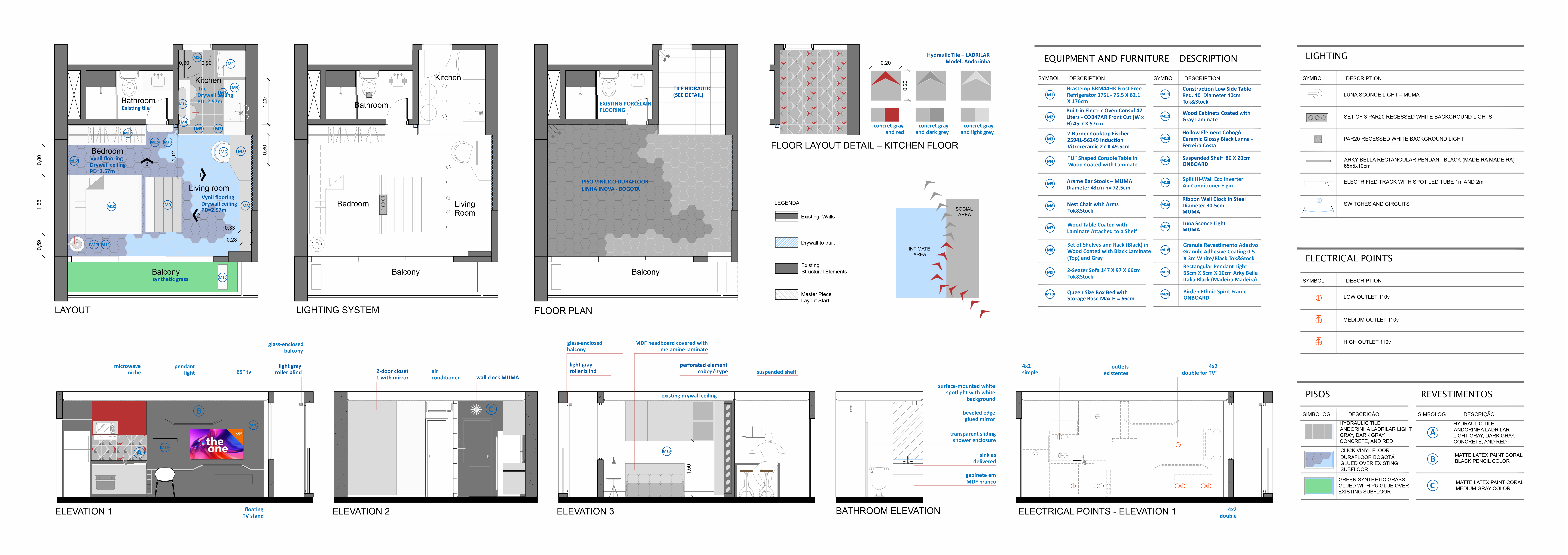 We opted for zoning the daily activities, delimitating kitchen by hydraulic tiles that extend along the equipment wall. On the opposite side, a sideboard serves as a dining area, supported by a suspended shelf. This wall also supports the home office and living area.