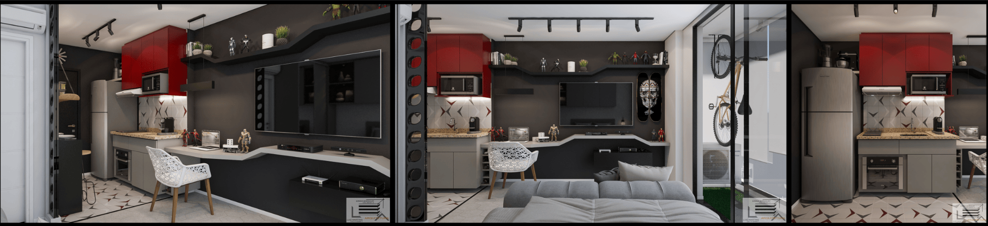 On the balcony, synthetic grass creates a contrast with the predominant black, gray, and white tones.
